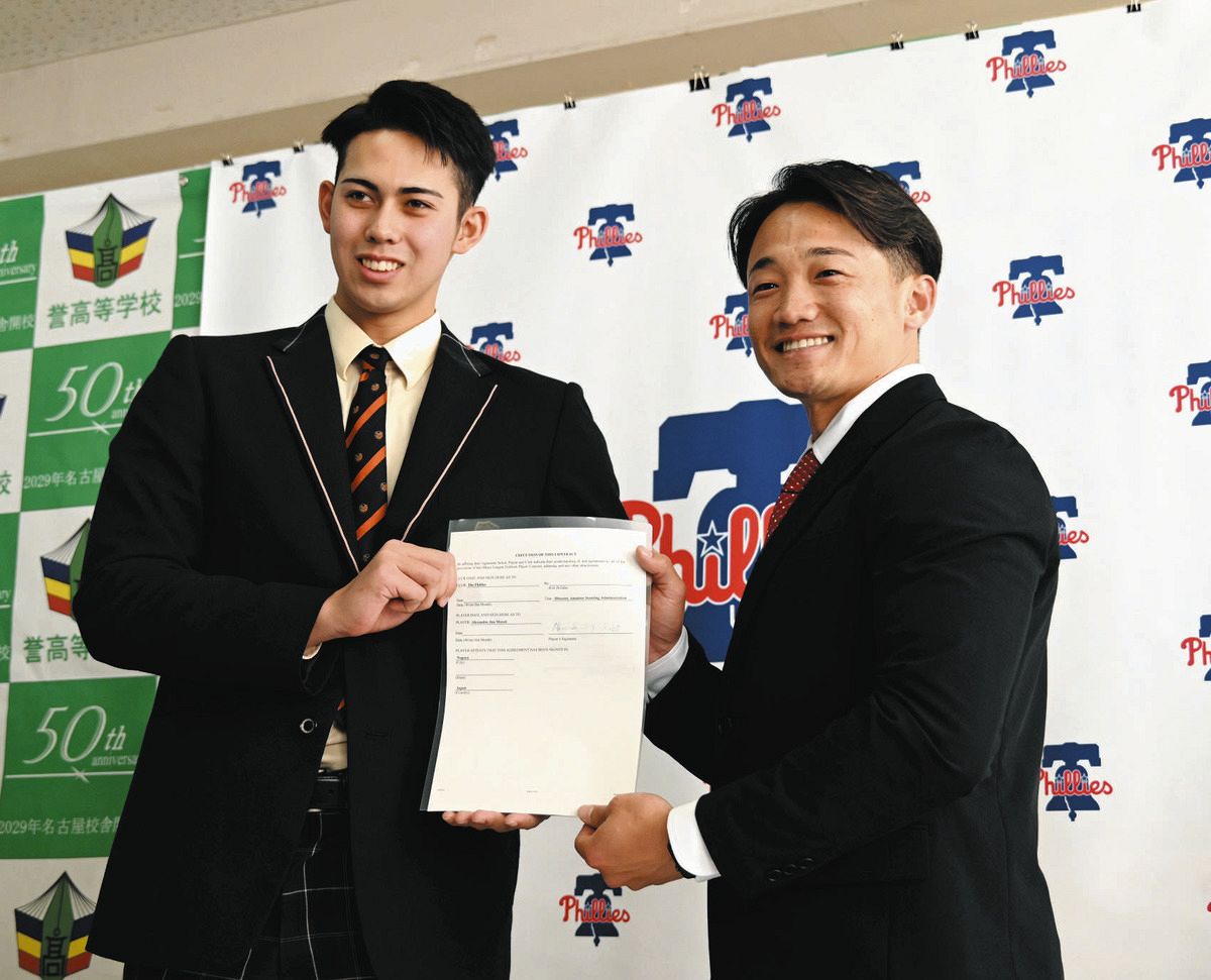 誉高校の最速147キロ右腕・モレチ・アレシャンドレ投手(18)が、米大リーグ・フィリーズとの入団会見に臨んだ。契約金1万ドル(約160万円)、奨学金3万5000ドル(約550万円)でマイナー契約を締結。背番号は「86」に決まった。身長194センチの規格外右腕は、「来年(メジャーの舞台に)立ちます」と力強く宣言し、憧れの大谷翔平選手との対戦を夢見て海を渡る。