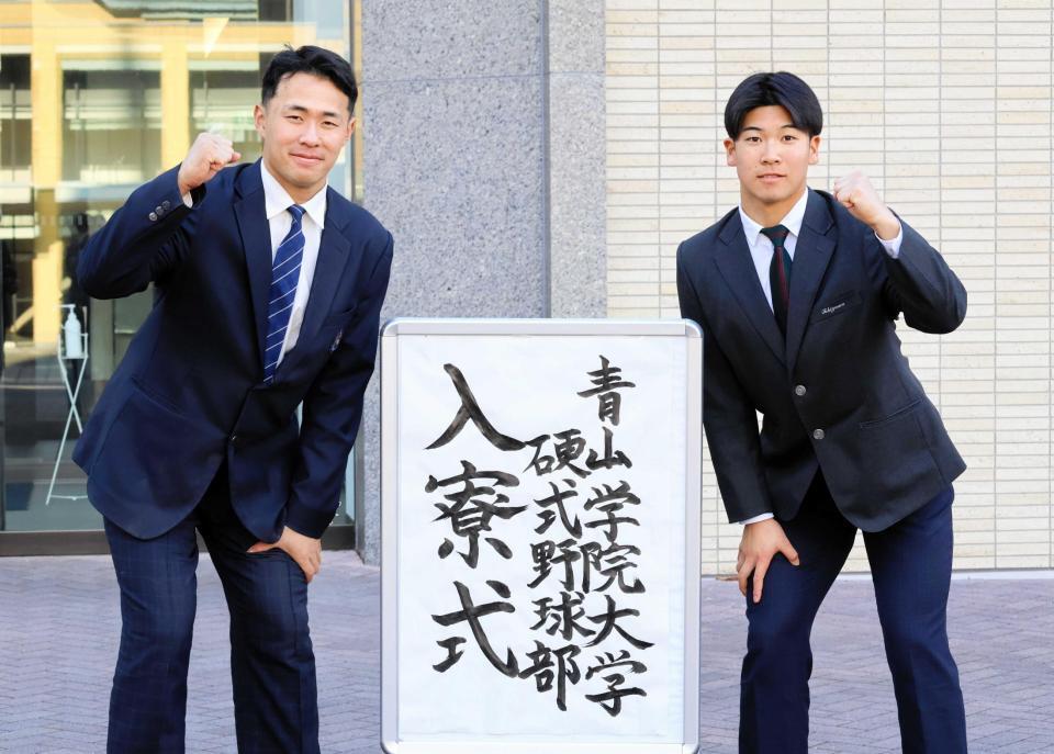 東都大学野球連盟の青山学院大学が神奈川県相模原市のキャンパスで2026年度入部予定者の入寮式を行った。今春のリーグ戦で史上初の7連覇を目指す常勝軍団に、最速153キロの二刀流・新井瑛太選手(滝川)と、高校通算33本塁打のスラッガー・金本貫汰選手(東海大相模)が加わり、揃って「ドラフト1位」でのプロ入りを目標に掲げた。